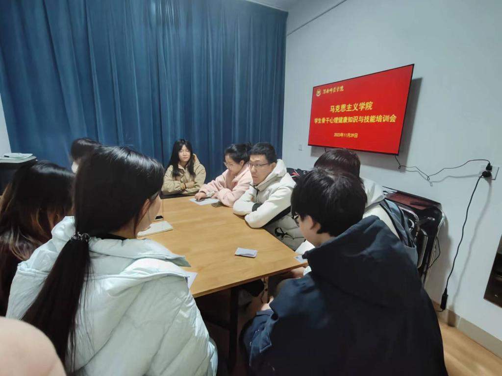 11月29日上午,马克思主义学院在学生社区党支部党团活动室召开学生骨干心理健康知识与技能培训会,学院团委负责人、心理专干关帅老师,辅导员陈晨以及2022级、2023级全体心理委员参加了此次培训会。