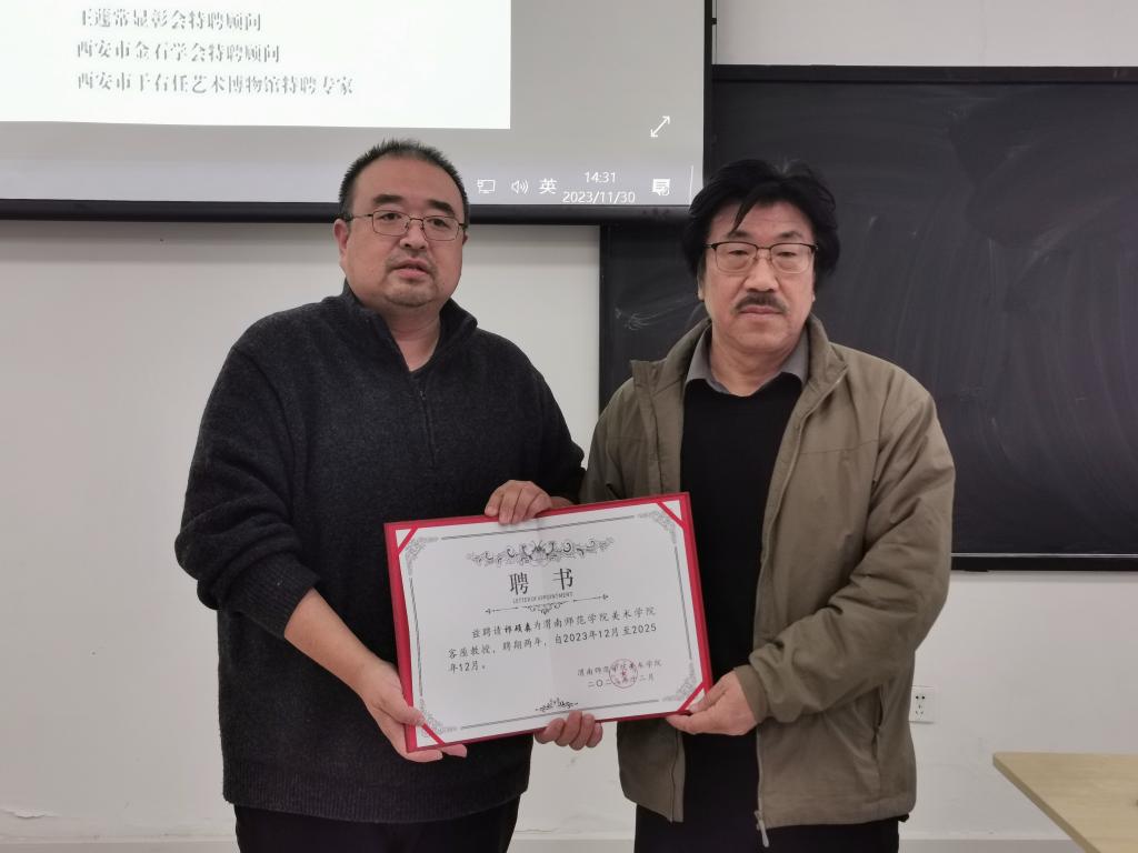 美术学院院长殷晓克为祁硕森教授颁发了渭南师范学院美术学院客座教授的聘书。