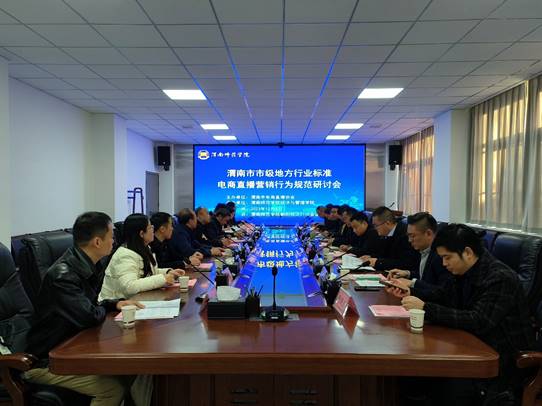 12月8日上午,由渭南市电商直播协会主办,渭南师范学院经济与管理学院承办的渭南市市级地方行业标准《电商直播营销行为规范》研讨会,在朝阳校区同心楼5105会议室举行。渭南市人力资源社会保障局、陕西铁路工程职业技术学院、渭南职业技术学院、渭南农投集团乡村振兴有限责任公司、陕西白鹿时光数字贸易有限公司、陕西勤奋新网传媒有限公司、陕西环洲丝路商贸有限责任公司以及我校科研处、经济与管理学院等政校企专家30余人参加研讨会。研讨会由经济与管理学院院长李富荣主持。