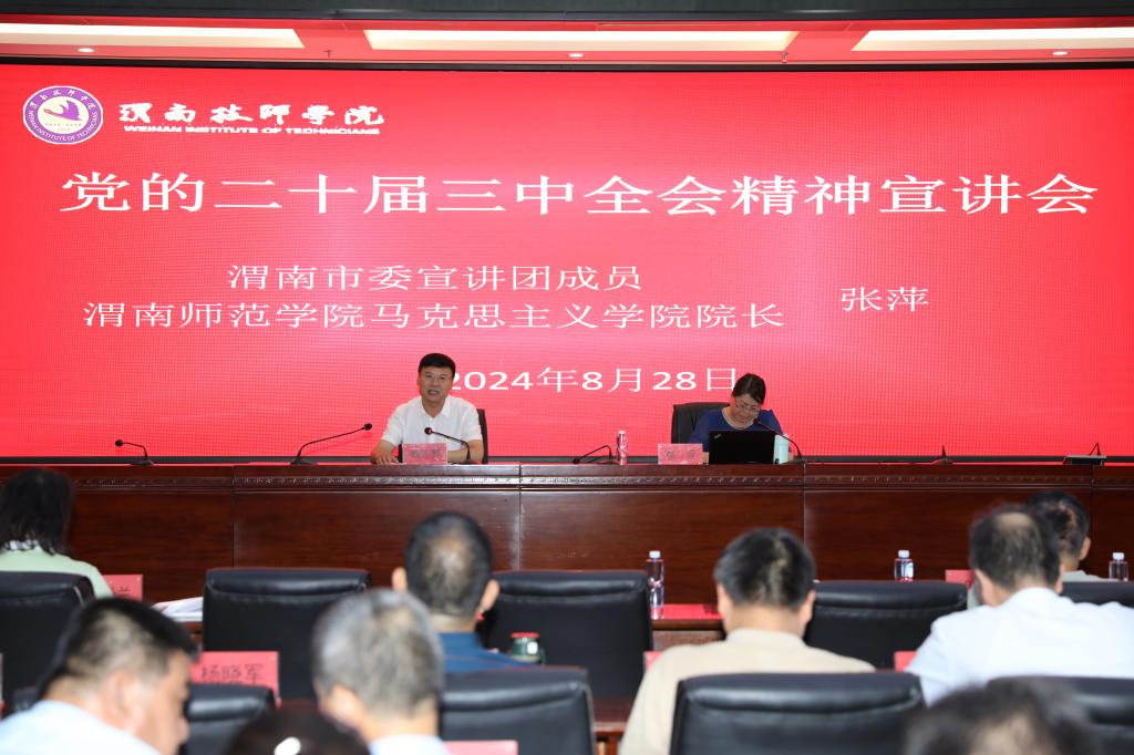 8月28日,张萍应渭南技师学院邀请,以《擘画改革新蓝图 奋进强国新征程 深刻领会和把握党的二十届三中全会精神》为题,为渭南技师学院处科级干部以“回望历程、挚守初心,意义非凡的三个三中全会”为切入点,从历史角度对党的二十届三中全会重大战略意义作出系统阐述,重点围绕“深入学习领会总书记在党的二十届三中全会上的重要讲话精神;领会精神、把握要义,读懂新一轮改革战略重点和全力以赴抓好全会精神贯彻落实等内容,对“七个聚焦”“六个必然要求”“四个迫切需要”“未来五年改革任务”作出详细解读,并就深刻认识党的十八大以来教育综合改革取得的显著成效和扎实抓好深化教育综合改革的重点举措落实进行了解读。(通讯员 张萍 审核人 赵国峰)