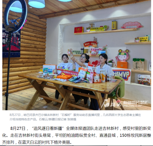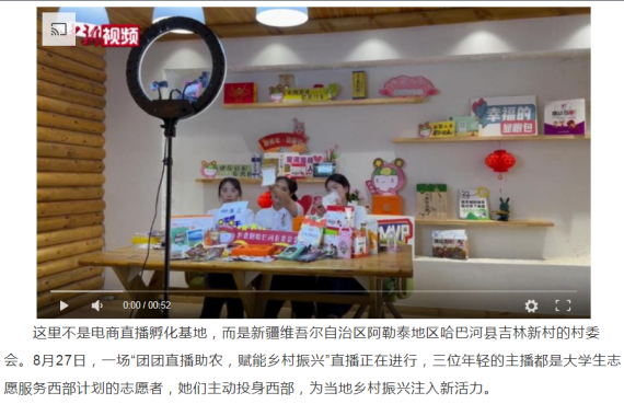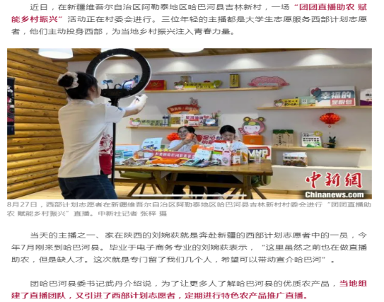 近日,《中国新闻网》《西部志愿汇》《凤凰网》等媒体报道了新疆维吾尔自治区哈巴河县三名西部计划志愿者直播助农的事迹,其中有我校经济与管理学院2024届毕业生刘婉荻。
