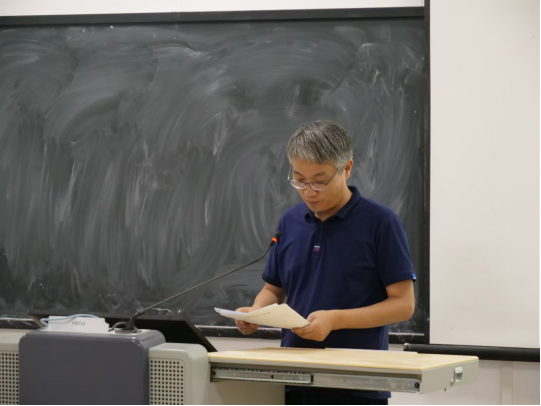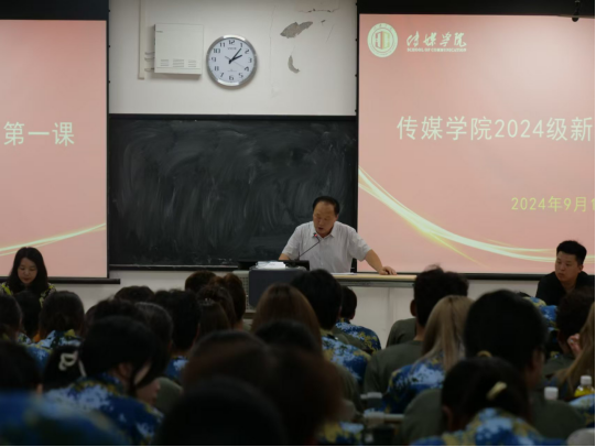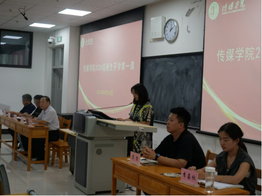 9月18日下午,传媒学院2024级全体新生在教学楼138教室同上开学第一课,学院党政领导班子成员讲授“开学第一课”。党总支副书记周双主持活动。