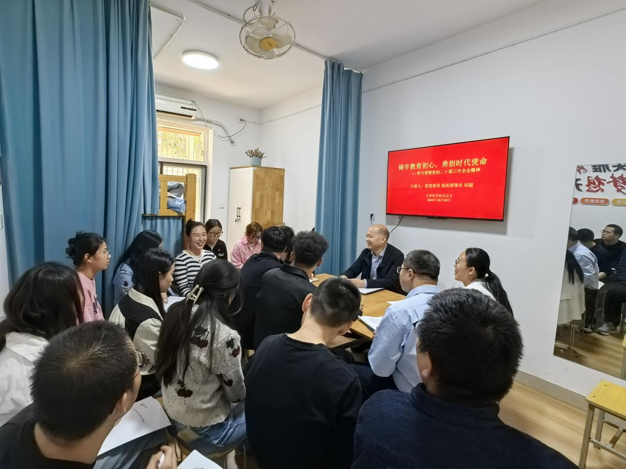10月10日下午,党委委员、组织部部长田超深入5号公寓计算机学院“一站式”社区,为师生作“筑牢教育初心,勇担时代使命”为题的党的二十届三中全会精神专题宣讲。学院党总支书记武楠、院长杨方琦、党总支副书记张俊娜、教师党员、党外知识分子代表及学生党员代表等参加宣讲会。