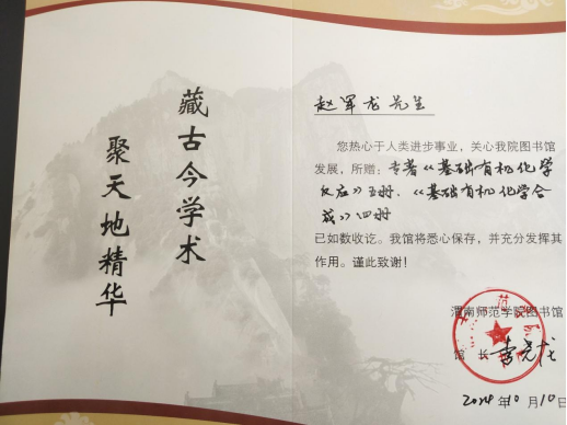 我校退休教师刘亦农先生一直关心图书馆事业的发展,近日,捐赠了专著《郑氏春秋》五册;赵军龙先生委托我校老师张晶捐赠了专著《基础有机化学反应》五册、《基础有机化学合成》四册,充实了图书馆馆藏。