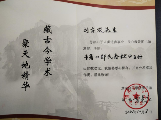 所赠著作图书馆已如数收讫,经图书编目后将与读者见面,图书馆敬予中共渭南市委党史研究室、刘亦农先生、赵俊龙先生图书捐赠证。(通讯员 张春丽 许艳 审核人 李尧龙)