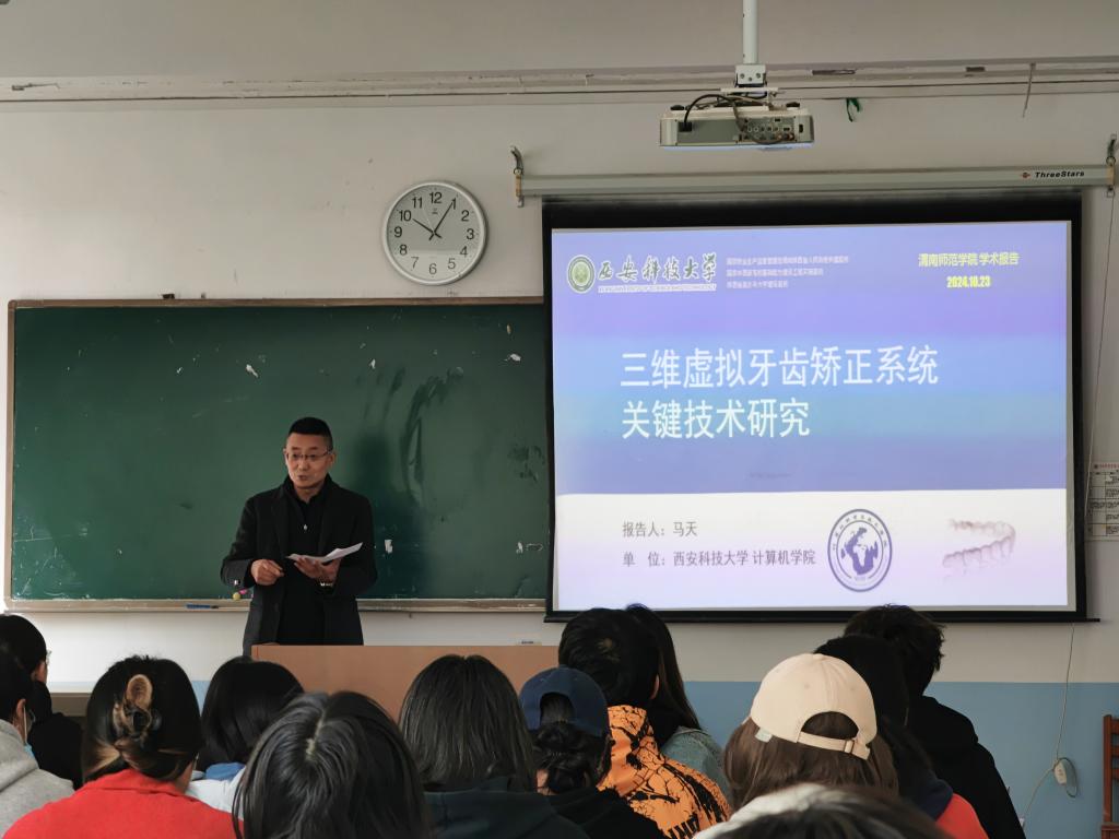 10月23日上午,计算机学院邀请西安科技大学计算机学院副院长马天教授为学生作学术报告,报告主题为“三维虚拟牙齿矫正系统关键技术研究”,大三60余名学生参加,报告由计算机学院副院长李云飞主持。