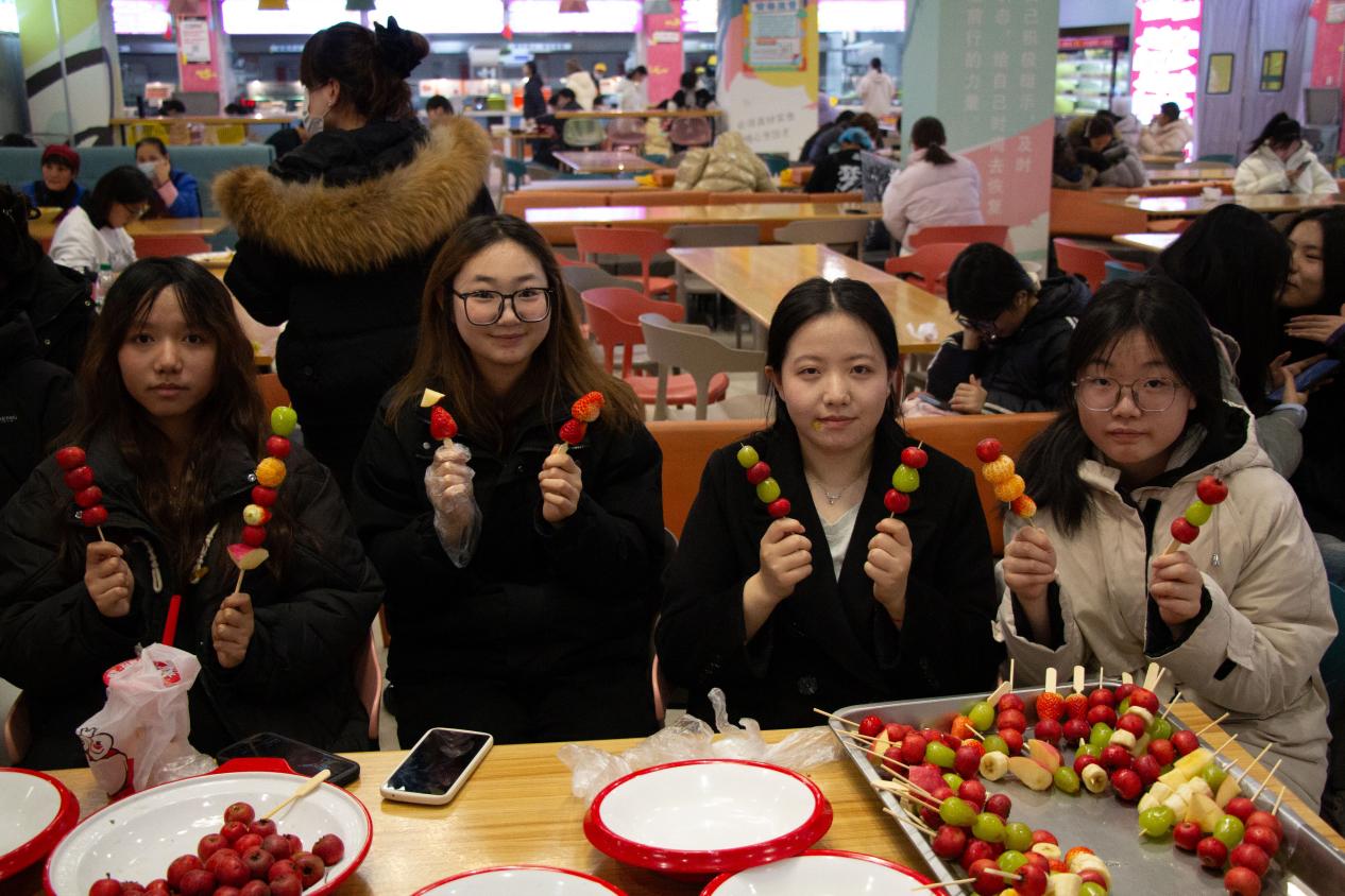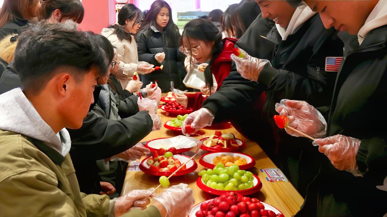 随后,活动现场被划分成了多个小组,在专业老师的指导下,师生们纷纷化身“糖艺大师”,小心翼翼地将它们串在竹签上,再蘸入熬得金黄透亮的糖浆中,旋转、翻滚,直至每一颗果实都被均匀地包裹上了一层晶莹剔透的糖衣。