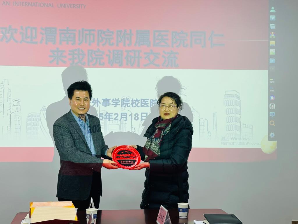 西安外事学院校医院院长周旭江及相关科室负责人参加了交流讨论。院长段楚雷首先介绍了此次交流调研的目的和内容。周旭江院长对我校一行到访表示欢迎,同时对西安外事学院的概况和校医院的建设发展、医院的定位和管理运行模式等作了系统、全面的介绍。附属医院党支部书记王雅蓉对西安外事学院的热情接待表示感谢,简要介绍了渭南师范学院及附属医院党支部基本情况,并代表附属医院接受了西安外事学院校医院赠送的校徽。