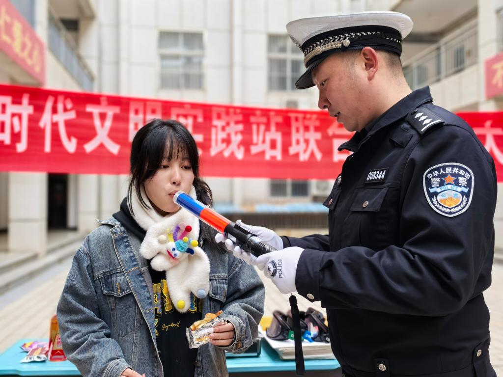 随后,艾警官与苗警官深入细致地讲解了交通安全法律法规,结合实际案例,生动阐述了常见交通违法行为的严重危害。为了让师生们有更直观的感受,两位警官现场展示了标准的交通指挥手势,详细介绍各类交通标志的含义;还准备了酒驾模拟眼镜,让师生们亲身模拟酒驾体验;更别出心裁地用蛋黄派、红牛、果酒、黄桃罐头等常见食品饮品,通过酒驾测试棒进行现场测试,直观呈现食用某些食品后可能导致的酒驾误判情况。