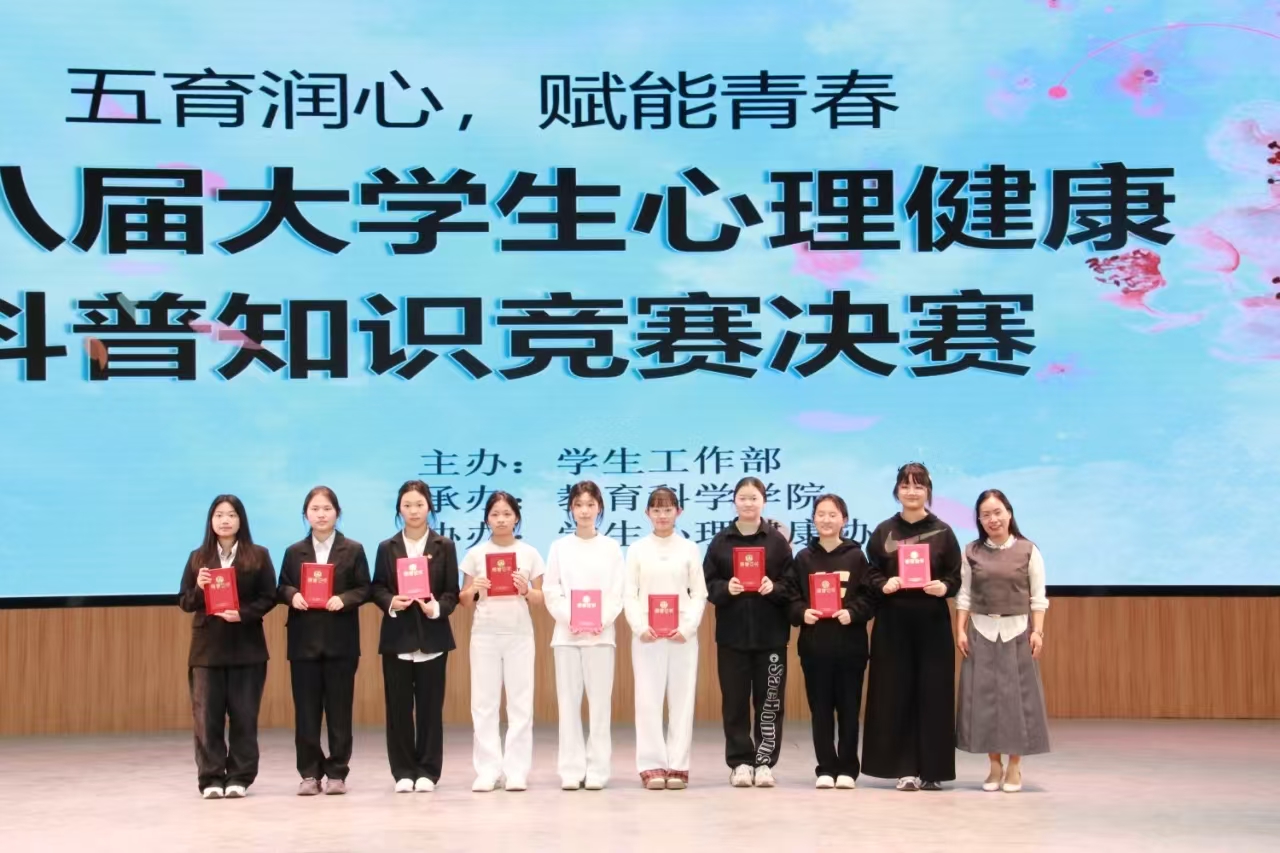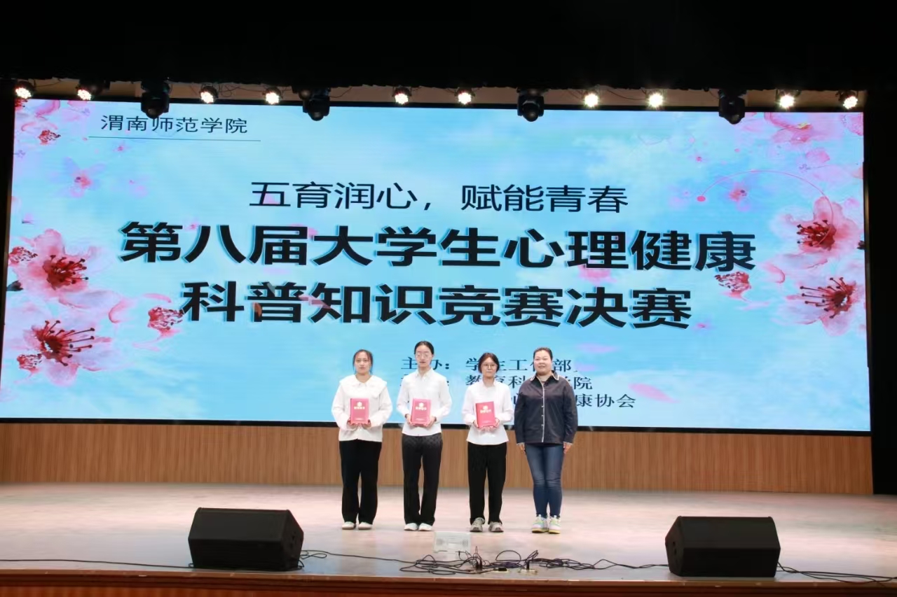 4月15日下午,我校第八届大学生心理健康科普知识竞赛决赛在陶然楼演艺厅落下帷幕。本次活动由学生工作部主办,教育科学学院承办。渭南市委文明办副主任王婧、渭南市中心医院精神心理科副主任张艳担任本次大赛嘉宾。