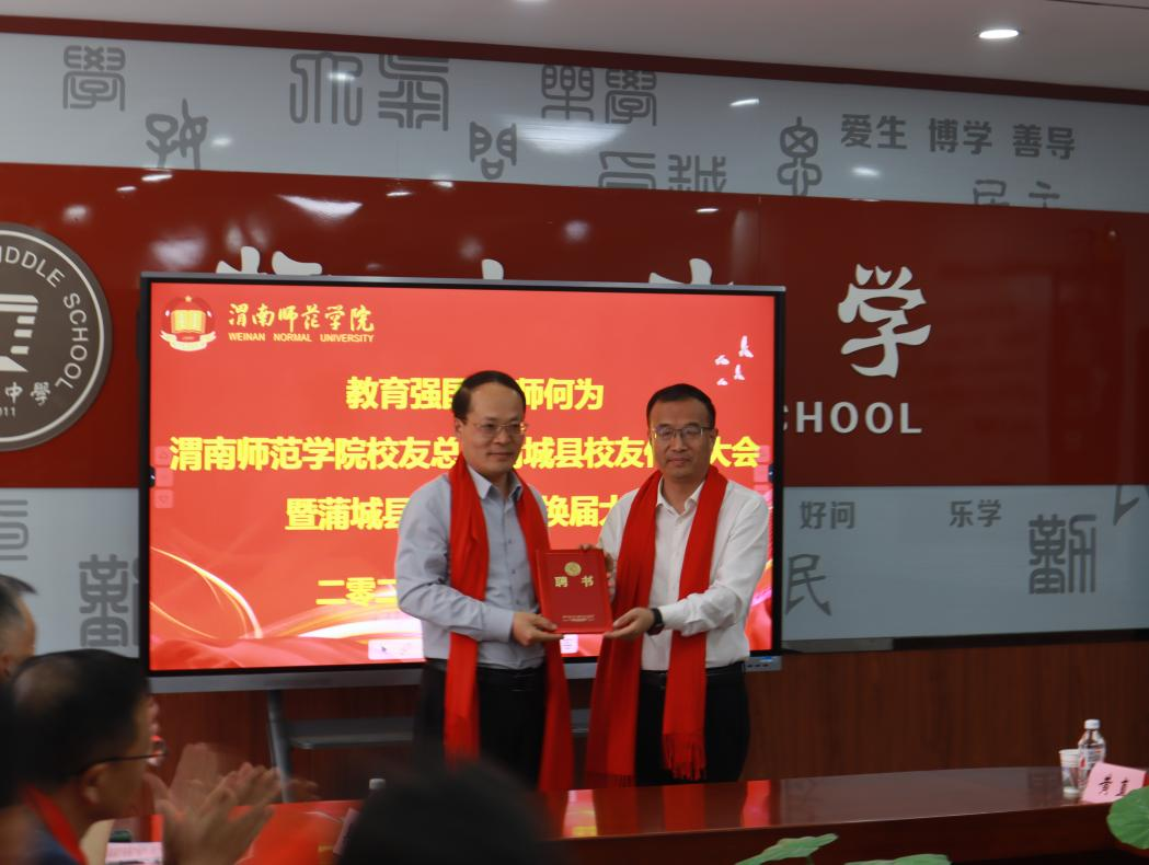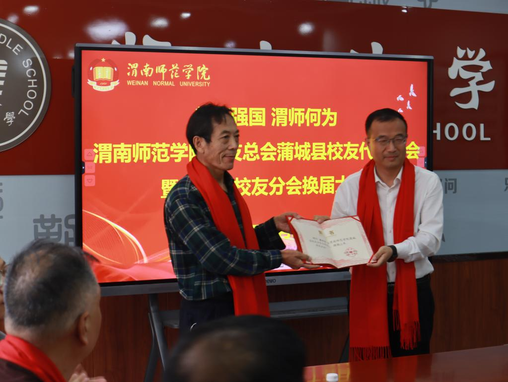 会上,与会人员观看了学校宣传片,第一届蒲城校友分会副会长张西岳回顾了分会工作成果,并介绍了换届筹备情况。数学与统计学院副院长戴磊宣读了《渭南师范学院校友总会关于蒲城县校友分会第二届组织机构人员组成的批复》,经全体校友审议表决,陈鸿任第二届会长,张西岳任名誉会长,黄志俭、陈启潮等9人组成新一届领导班子。副校长曹强为新一届组织机构成员颁发聘书。