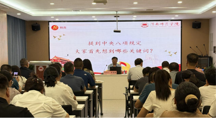 常青林围绕深刻领会中央八项规定精神的内涵与意义、高校普遍存在的突出问题与风险点剖析、我校深入贯彻中央八项规定精神的举措等方面展开深入解读,重点结合分管和联系部门学院的实际工作,就深入践行中央八项规定精神、推动学校高质量发展提出明确要求。他以互动提问等方式引导大家深入思考,以具体案例生动阐述了作风建设的重要性与紧迫性。他表示,全体党员干部要时刻保持清醒头脑,深刻认识到作风建设的长期性和复杂性,切实增强贯彻中央八项规定精神的自觉性和坚定性。他强调,党的十八大以来,以习近平同志为核心的党中央以“得罪千百人、不负十四亿”的使命担当祛疴治乱,成为新时代共产党人作风建设的一张“金色名片”,是长期有效的“铁规矩”,作为立德树人主阵地,必须以优良党风引领“勤奋质朴、自强不息”的校风、“乐教爱生、春风化雨”的教风和“好学深思、明辨笃行”的学风。