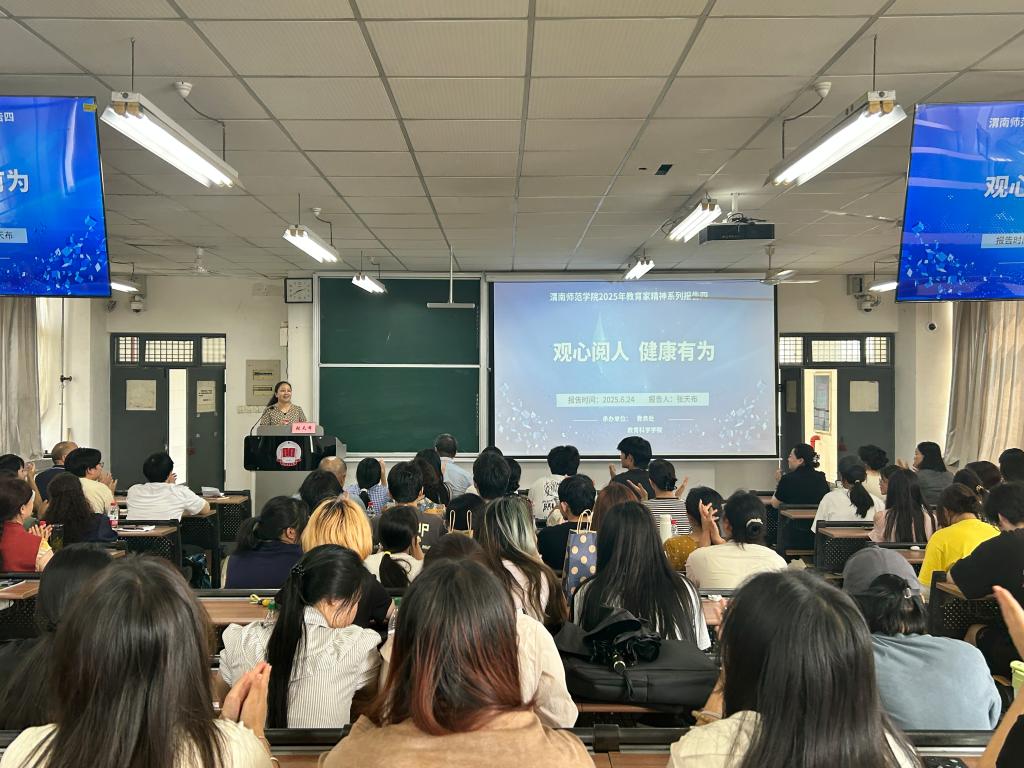 6月24日下午,教育科学学院特邀西安终南心理首席督导师、陕西省人民医院心理科主任医师张天布在知新楼2501作题为“观心阅人 健康有为”的专题报告。心理学专业师生、渭南市精神卫生中心和渭南市中心医院相关医师、渭南市青少年心理健康教育分会部分代表、渭南中小学心理辅导教师代表参与聆听,报告由教育科学学院副院长马雅菊主持。