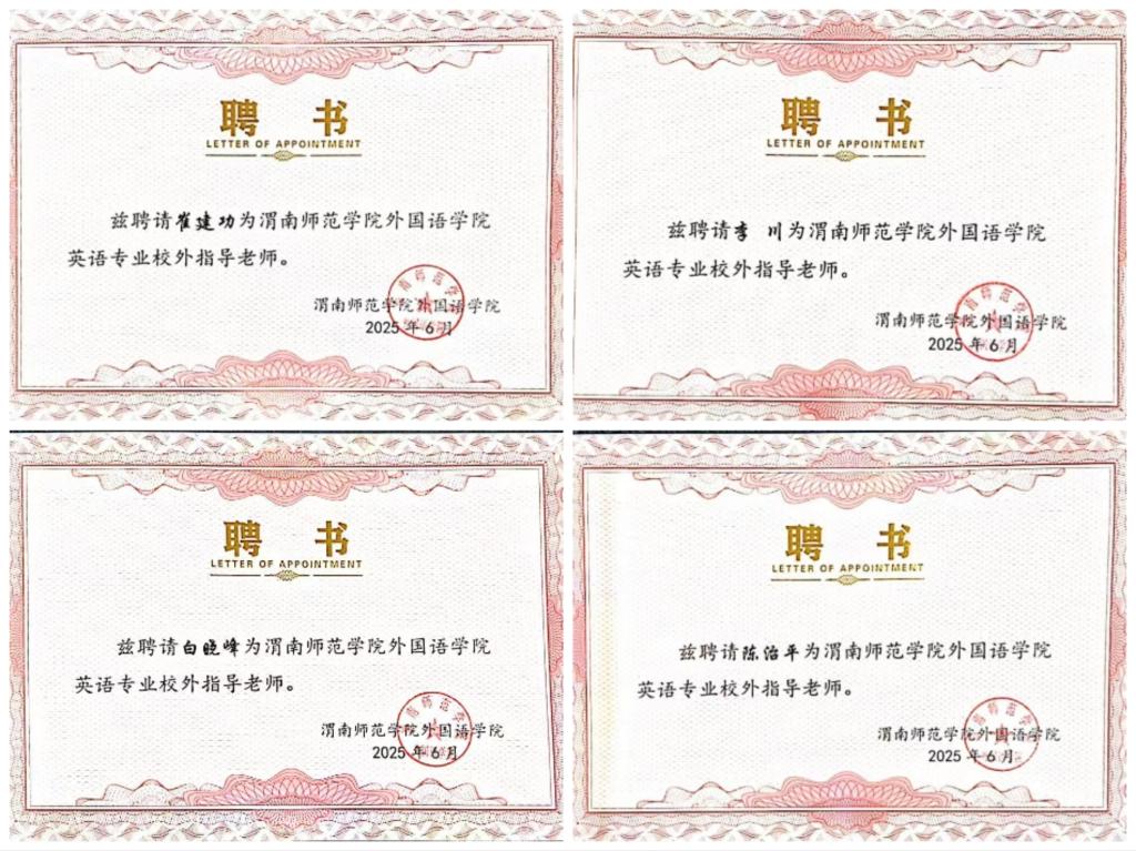专题报告结束后,院长李海荣向四位校长颁发英语专业校外指导老师聘书。