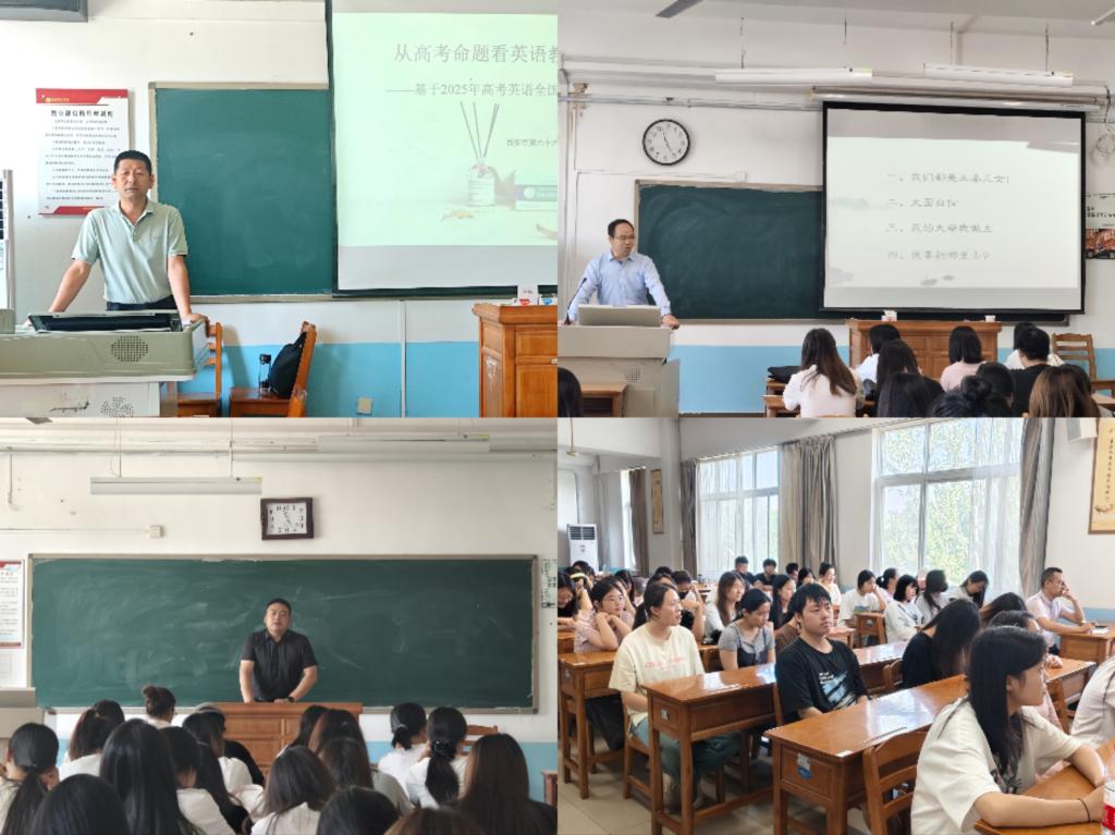 随后,三位校长为外国语学院师生带来了精彩的专题报告。崔建功副校长以《从高考命题看英语教师核心素养培养—— 基于2025年高考英语试题的教学策略启示》为题,剖析高考英语试题命题趋势,结合完形填空、阅读理解等案例,讲解在教学中渗透语言运用、思维品质和文化意识等核心素养的方法。白晓峰校长以《仰望星空,脚踏实地 —— 把握自己的人生,主宰自己的命运》为题,用个人教育经历激励学生树立远大理想,珍惜大学时光,提升综合素质。李川副校长围绕《班主任及班级管理,师范生的必修课》,通过班级管理实例,强调师范生培养班级管理能力、掌握沟通技巧的重要性,让学生对班主任工作有了深刻认识。