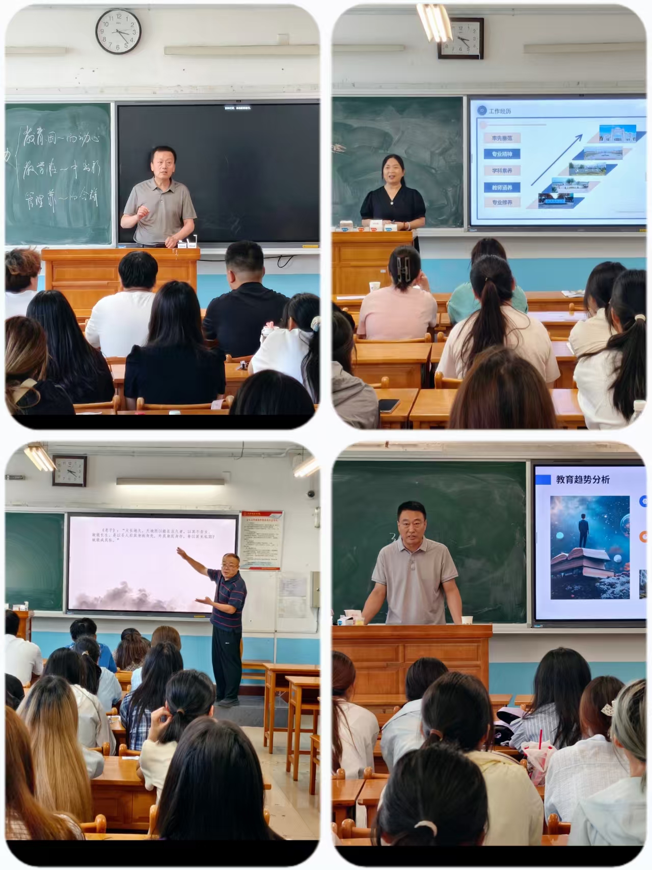 段小虎以《面对现实解决问题》为题,强调作为新手教师要积极主动,少说多做,态度决定一切,并告诫师范生们要多读书,多思考,多反思。刘新博副校长围绕《青年教师的专业成长》,提出教师应从专业知识、专业能力深耕自己,努力提高自己教学等级,取得行业内人士认可。从职业规划、能力提升等维度,为师范生指明成长方向。李宝林作《迈向合格教师:我的实践与思考》报告,建议新手教师严格要求自己,注重实践,提高解决问题能力。分享从教经验与职业感悟,助力师范生筑牢职业根基。