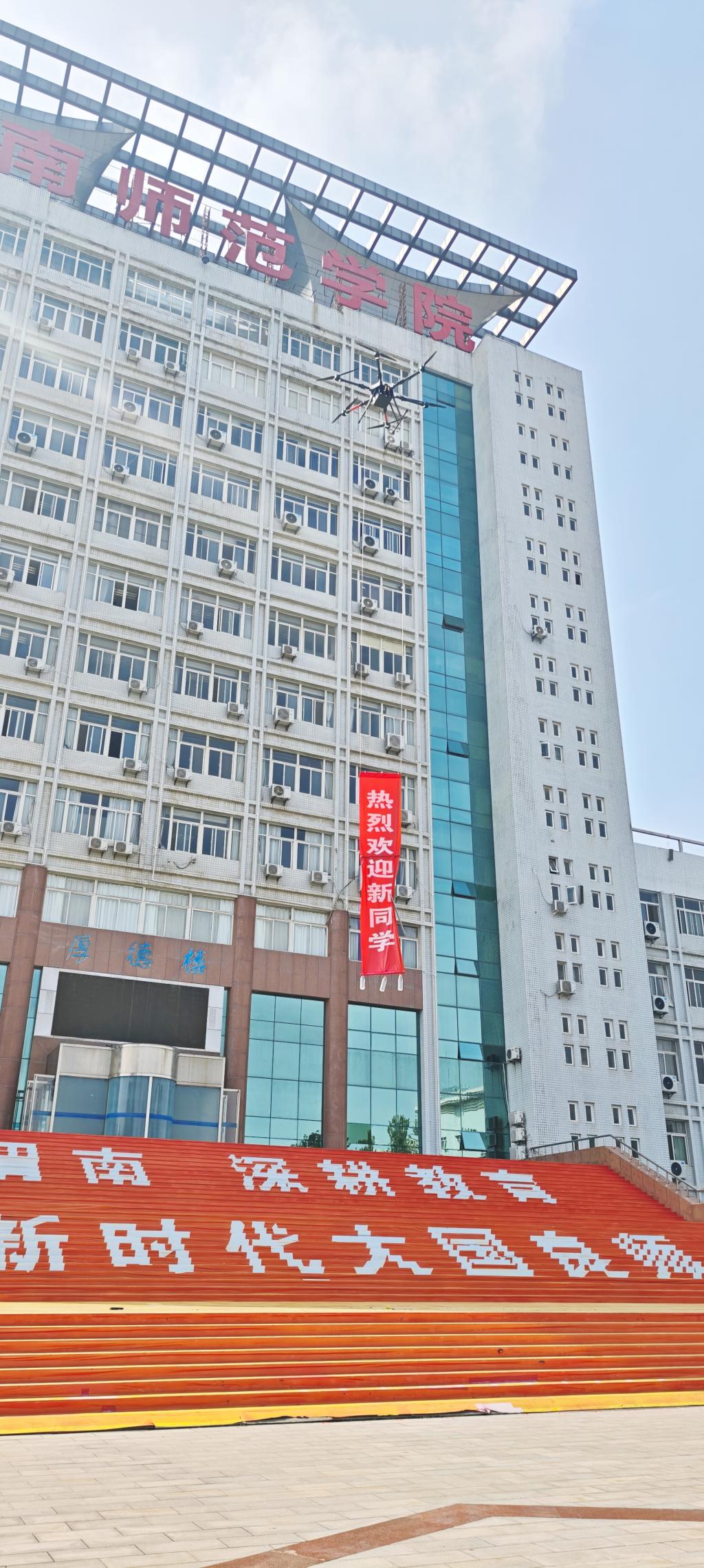 9月13日,我校迎来了2025级新生入学报到。继续教育学院别出心裁,利用无人机在学校主楼厚德楼上空悬挂“欢迎新同学”条幅,以创新科技的方式向新生表达期待与欢迎。