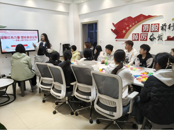 11月12日,数学与统计学院举办“凝聚红色力量 塑绘奋进征程”党建心理疗愈粘土创作活动。学院心理专干张洁荣、学生党员及其他学生代表齐聚一堂,以粘土为媒,在指尖创作中传承红色基因,在协作交流中滋养心灵成长。