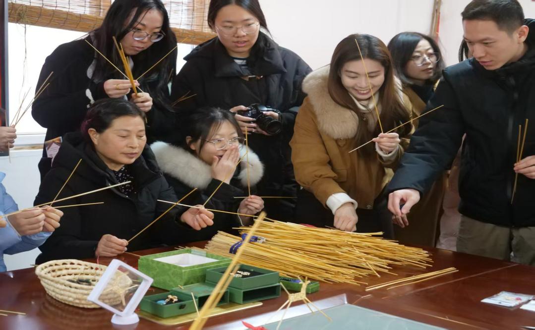 活动首站来到桥南镇巧娘草编专业合作社,参观陕西省非物质文化遗产——“临渭草编”主题展览,深入了解渭南草编的历史渊源与工艺特色。在草编专业合作社社长、非遗传承人、陕西省劳动模范——陈春苗手把手教学下,大家分组动手编织,在穿绕编结间完成专属草编作品,真切体会传统手工艺的魅力,加深对中华优秀传统文化的理解与认同。学院与巧娘草编专业合作社签订教学实践、学生就业、劳动教育基地协议。