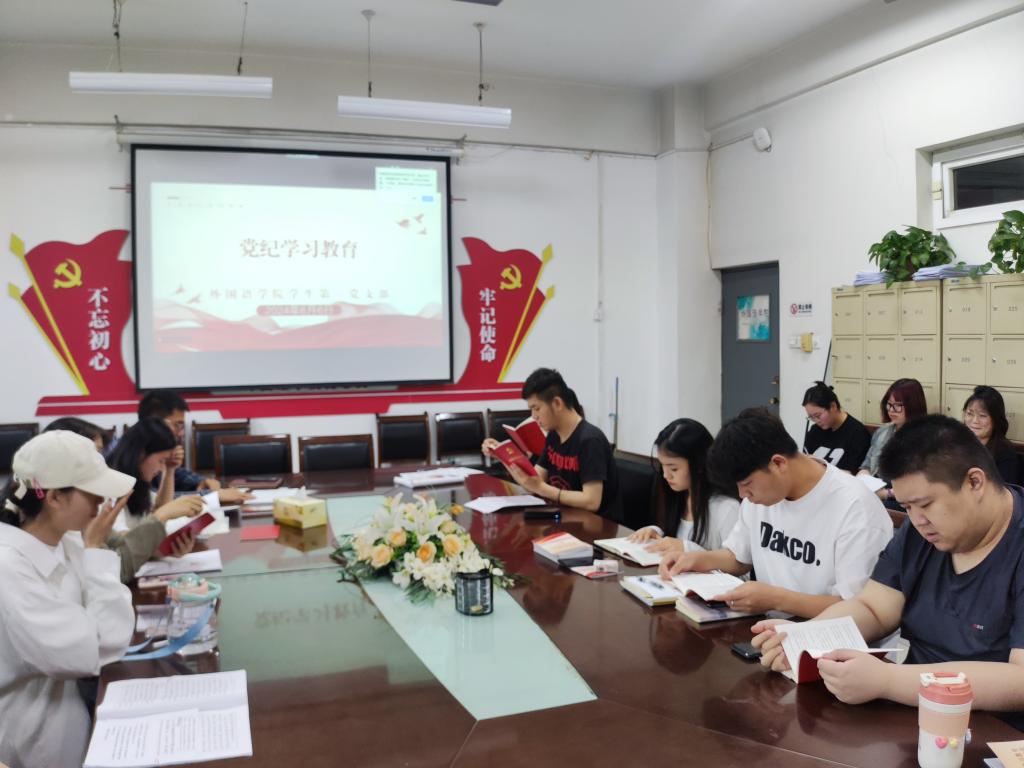 6月11日下午,外国语学院学生第一党支部在致远楼4411会议室召开党纪学习教育专题学习会。会议由支部书记介梦萌主持,支部全体党员参会。