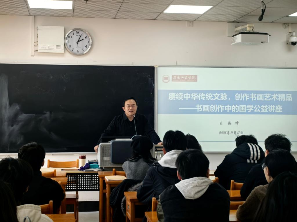 11月11日下午,美术学院举办题为“赓续中华传统文脉,创作书画艺术精品”的专题讲座。本次讲座特邀学校副校长王海峰担任主讲,书法学80余名学生参加,美术学院院长石海彬主持。