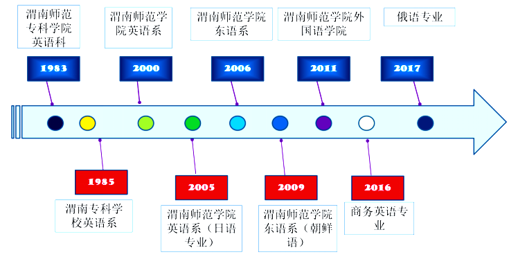 外国语学院是渭南师范学院办学历史最悠久的院系之一,其的历史可以追溯到1983开设的渭南师范专科学校英语科,1985年设英语系,2000年开始招收第一届4年制本科生。2005年学校成立东语系,开设日语专业,2009年增设朝鲜语专业。2011年学校改革管理机制,原英语系和东语系合并,成立外国语学院。学院现设有英语系、东语系、俄语系3个教学系及1个大学外语教学部,2个研究中心(外国语言文化和外语教育研究中心和泰国研究中心);开设英语(师范)、日语(师范)、朝鲜语、商务英语、俄语5个本科专业,招收本科和专升本两个层次的学生。