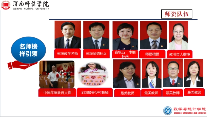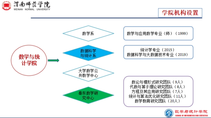 数学系是渭南师范学院最早成立的院系之一,2010年与计科系组建成立数学与信息科学学院,2014年与物电学院组建成立数理学院,2019年独立为数学与统计学院。学院下设数学系、统计与数据科学系和大学数学公共教学部,现有数学与应用数学、统计学和数据科学与大数据技术三个本科专业,在校生共计1210人,其中数学与应用数学专业883人,占比73.0%;统计学专业159人,占比13.1%;数据科学与大数据技术专业168人,占比13.9%。数学与应用数学专业2021年入选国家“双万计划”省级一流专业建设点,2022年顺利通过教育部师范专业二级认证。