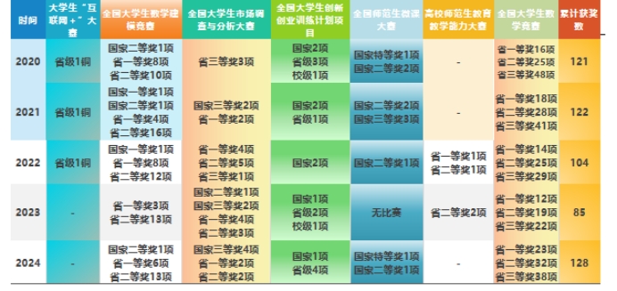 学院每年定期开展师范生技能训练,包括三笔字和基本教学技能,效果显著。2024年学生获全国大学生数学建模竞赛获得国家二等奖1项、省级一等奖6项、省级二等奖13项;全国市场调研大赛获得国家三等奖4项,陕西省一等奖2项、二等奖2项;获批大创项目国家级1项、省级4项;全国大学生数学竞赛获得省级一等奖23项、二等奖32项、三等奖38项;第十届“田家炳杯”全国师范院校师范生教学技能竞赛获三等奖1项;全国师范生微课大赛获特等奖1项、一等奖1项的优异成绩。