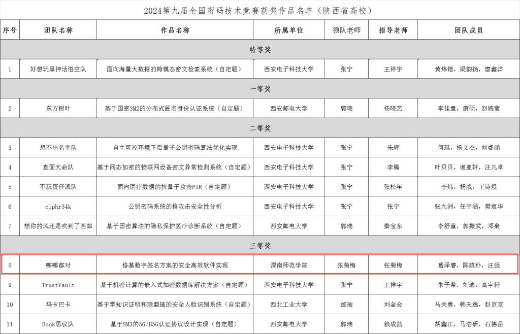 全国密码技术竞赛是国内级别最高、影响力最大的密码学赛事,旨在“提高密码意识、普及密码知识、实践密码技术、发现密码人才”。本次大赛中,陕西省共有四所高校的22支队伍获奖,其中我校作为唯一一所地方师范院校,能够在众多高水平参赛队伍中脱颖而出,充分体现了学校在密码技术领域的教学与科研潜力。