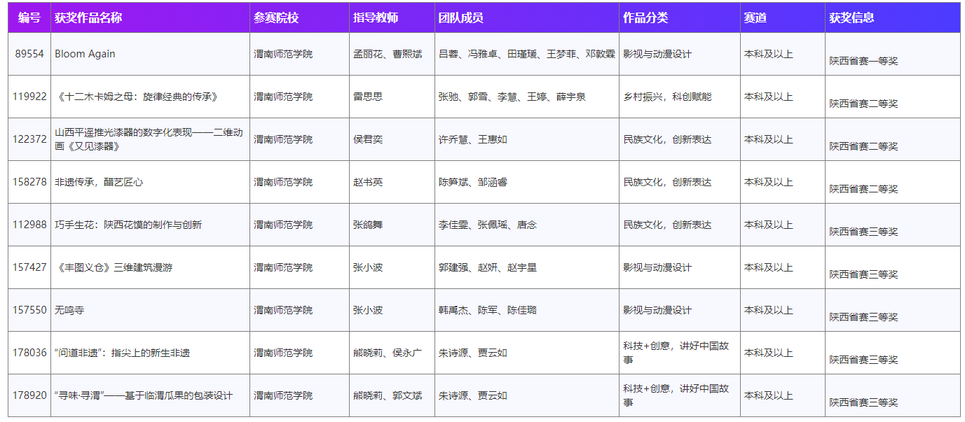 近年来,我校主动对接渭南市经济社会发展,激励研究团队深耕于渭南市文化遗产传承创新。2023年,我校获批“陕西省非物质文化研究基地”,以此为契机,我校传媒学院、计算机学院、教育科学学院等院的师生创作出一批优秀作品,如《十二木卡姆之母:旋律经典的传承》《山西平遥推光漆器的数字化表现——二维动画<又见漆器>》《非遗传承,醋艺匠心》《巧手生花:陕西花馍的制作与创新》《“问道非遗”:指尖上的新生非遗》《“寻味·寻渭”——基于临渭瓜果的包装设计》等,这些作品不仅丰富了非物质文化遗产的传承内涵,也展现了我校师生的创意与匠心。