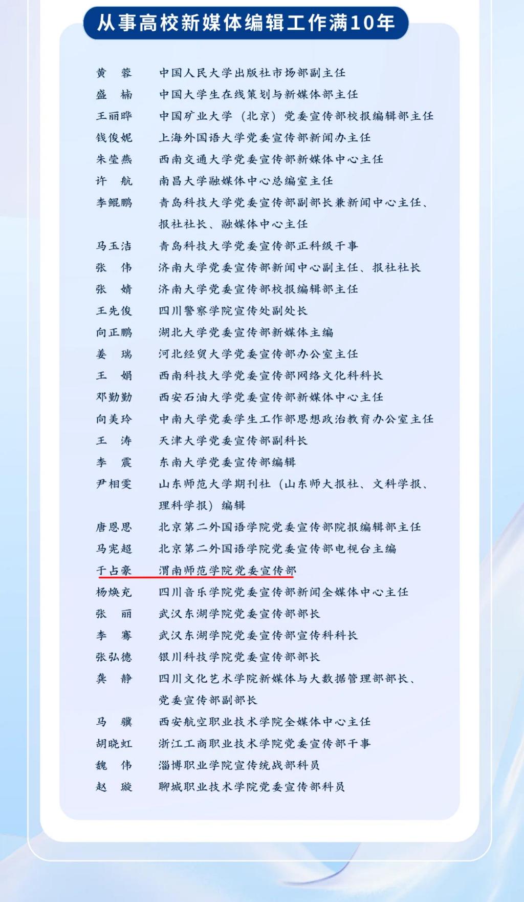 【光荣榜】我校宣传干部获得“从事高校新媒体编辑工作满10年”荣誉
