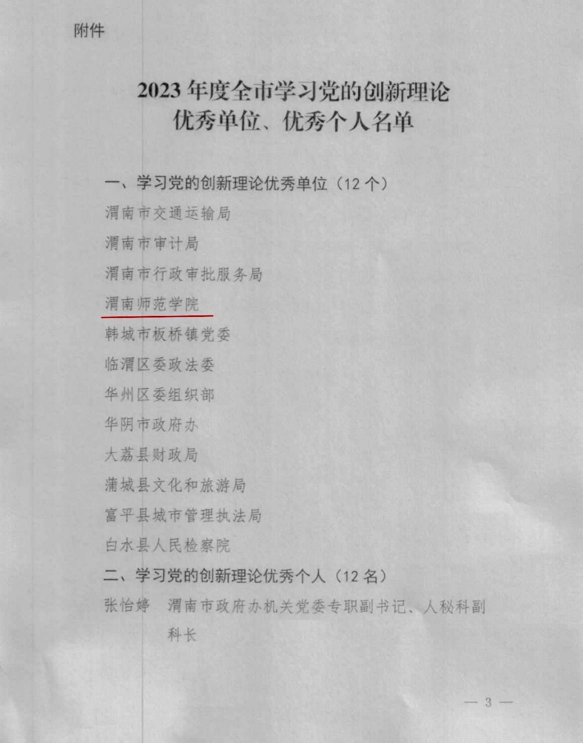 在近日公布的“关于表扬2023年度全市学习党的创新理论优秀单位、优秀个人的通报”中,我校作为全市12个学习党的创新理论优秀单位之一,受到通报表扬。