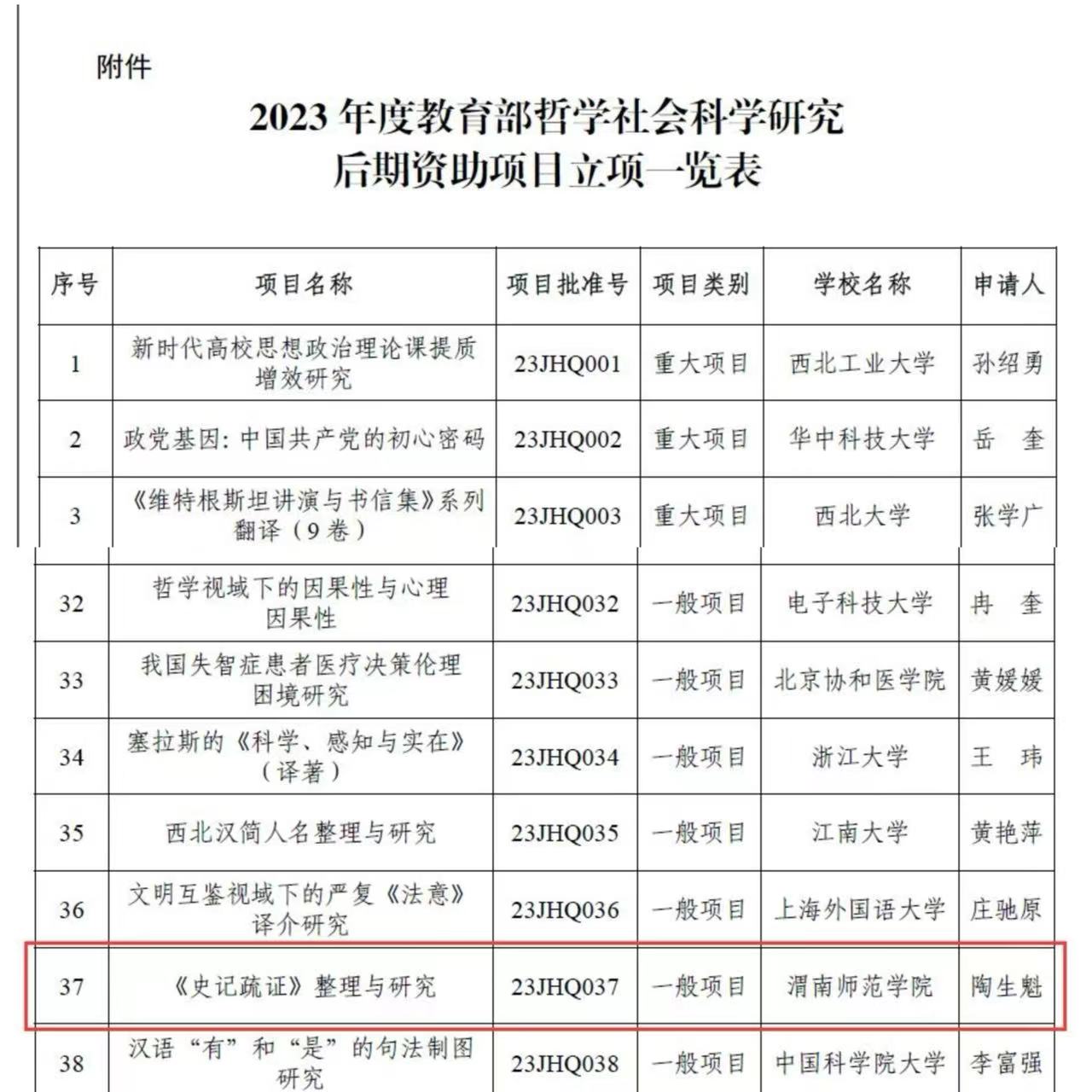 近日,教育部社科司正式公布了2023年度教育部哲学社会科学研究后期资助项目立项名单,我校人文学院陶生魁教授申报的“《史记疏证》整理与研究”获批一般项目,资助经费10万元。