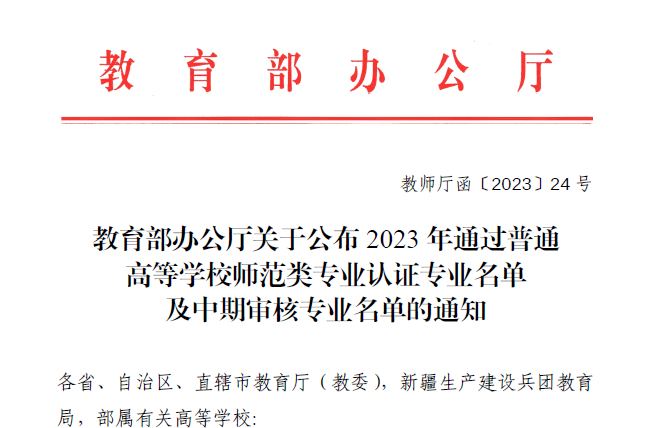 近日,教育部办公厅公布了2023年通过普通高等学校师范类专业认证专业名单及中期审核专业名单。我校数学与应用数学专业通过教育部师范类专业第二级认证,认证结论有效期六年。这是我校第二个通过教育部师范类二级专业认证的专业。