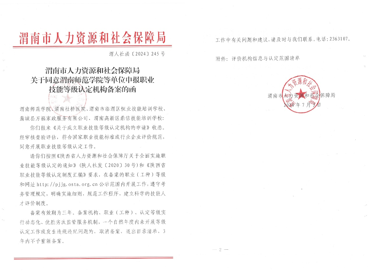 7月10日,我校收到渭南市人力资源和社会保障局发布的《关于同意渭南师范学院等单位申报职业技能等级认定机构备案的函》(渭人社函[2024] 245号),正式获得面向社会开展职业技能等级认定工作的资质。此次我校获得行政办事员、电子商务师、计算机程序设计员、物业管理师、劳动关系协调员、企业人力资源管理师、装饰美工、公共营养师共8个职业(包含初级、中级、高级、技师、高级技师五个等级)工作技能等级的认定资质,可以面向社会开展职业技能等级认证工作,有效期为3年。