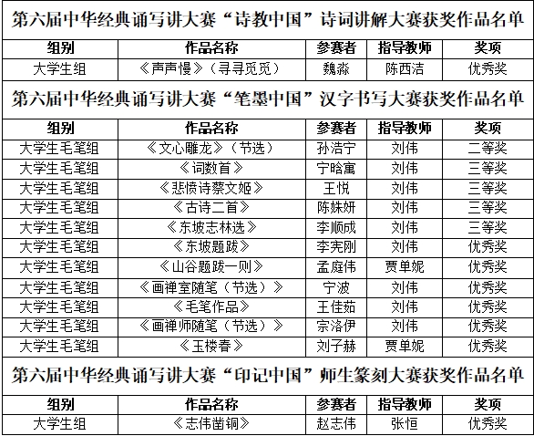 近日,教育部办公厅公布了全国第六届中华经典诵写讲大赛评选结果。我校选送参赛的“诗教中国”诗词讲解作品荣获全国优秀奖1项。“笔墨中国”汉字书写作品荣获全国大学生毛笔字组二等奖1项、三等奖4项、优秀奖6项。“印记中国”师生篆刻作品荣获全国优秀奖1项。
