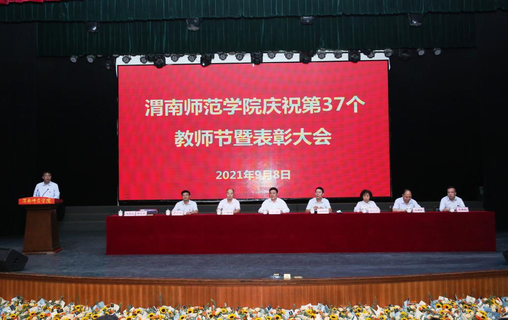 会上,党委书记卓宇致辞。他向全体教职员工送上节日的祝福,向受到表彰的教师表示热烈的祝贺和崇高的敬意,并对全体渭师人在学校建设和发展中取得的优异成绩表示肯定。他强调,我们要认真学习贯彻习近平总书记关于教育的重要论述和“七一”重要讲话精神,铭记红色历史,传承红色基因,不忘教育报国初心,勇担立德树人使命,积极投身教育教学改革,努力为党育人、为国育才。他提出,要落实立德树人根本任务,努力提高做好思想政治教育工作的本领;树立良好师德师风,增强知识储备提升育人能力;积极探索新时代教育教学方法,不断提升教书育人本领;潜心教书育人,在严爱相济中让学生亲其师、信其道,他表示,近期学校将组织开展优秀教师事迹宣传、主题作品征集、教师座谈会、走访慰问一线教师、“为教师亮灯”等尊师主题月系列活动,这对于加强尊师文化建设、展示教师良好形象、增强教师教书育人使命感荣誉感都具有重要意义。他指出,学校要进一步关心教师成长需要,为广大教师营造安心从教的育人环境,以实际行动积极主动为教师排忧解难;要深入开展“我为师生办实事”实践活动,从教师工作生活中最现实的问题着手,用心用情用力解决教职工的急难愁盼事,坚持把好事办实,实事办好,以最大的决心营造教师安心、静心从教的环境,让教职工有更多的幸福感获得感。他希望,全体渭师人要始终坚持 “四个相统一”,努力做好学生的“四个引路人”,奋勇争当 “四有好老师”,担当好新时代人民教师的时代重任,不遗余力、满腔热情地奉献教育事业,在平凡的教书育人岗位上做出渭师人的新业绩、新贡献!