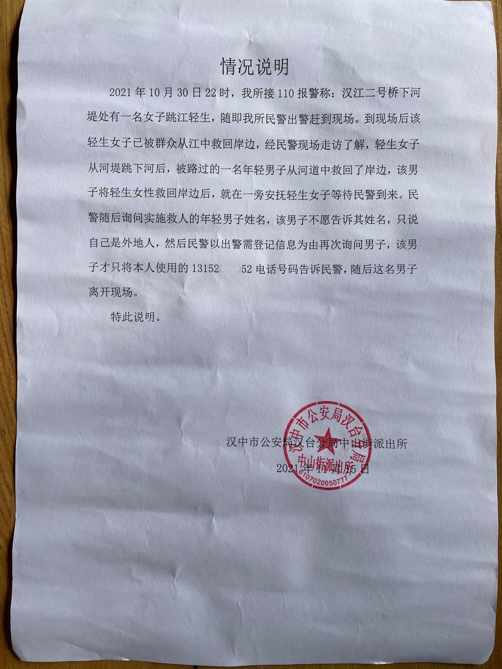 近日,我校收到一封来自汉中市公安局汉台分局中山街派出所的一封情况说明,说明中陈述了一件奋不顾身、勇于救人的好人好事。经核实,该说明中提到的“不愿透露姓名的年轻男子”是我校美术学院2019级产品设计专业1班郭宇轩同学。