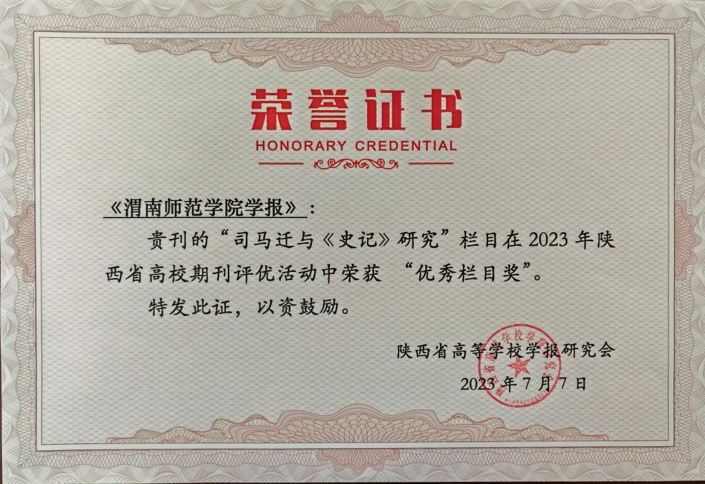 《渭南师范学院学报》获“陕西高校精品社科期刊”(排名第一),特色栏目“司马迁与《史记》研究”获优秀栏目奖。牛怀岗编审因在高校学报行业从业三十年以上,获“玉笔奖”。曹静获“优秀编辑”称号,薛一筝获“优秀青年编辑”称号,马小侠获“优秀编辑学论文奖”。(通讯员 薛一筝 审核人 詹歆睿)