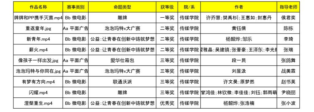 近日,第十五届全国大学生广告艺术大赛(简称大广赛)陕西赛区获奖名单发布。我校传媒学院获奖作品共计9项。其中一等奖1项,二等奖3项,三等奖4项,优秀奖1项。该大赛是全国普通高校大学生学科竞赛排行榜赛事。