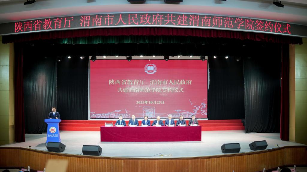 10月25日上午,陕西省教育厅与渭南市人民政府共建渭南师范学院签约仪式举行。市委书记樊维斌,省委教育工委书记刘建林出席并讲话。省教育厅厅长王树声、市长陈晓勇现场签订协议书。渭南市委常委、市委组织部部长,市政府副市长、党组副书记、渭南高新技术产业开发区党工委书记高振鑫,渭南师范学院党委书记卓宇、校长张守华参加活动。副市长刘宝琳主持签约仪式。