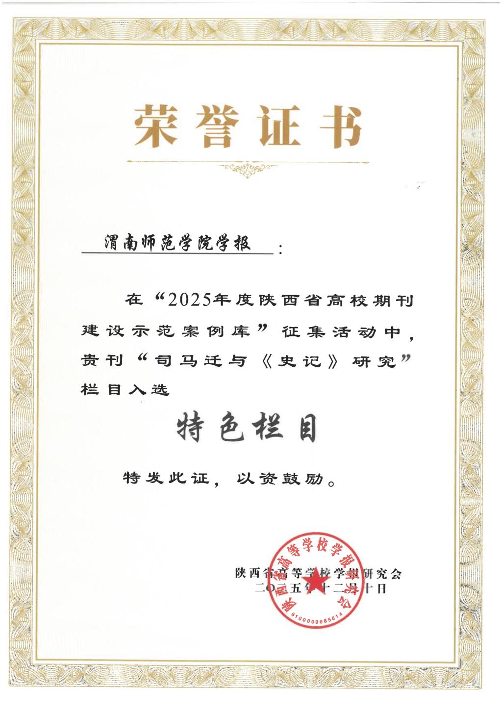 近日,由陕西省高校学报研究会组织的“2025年度陕西省高校期刊建设示范案例库”征集活动公布了评选结果,我校学报入选“精品期刊”案例,《司马迁与〈史记〉研究》入选“特色栏目”案例。曹静同志的学术论文《高校学术期刊出版融合实践路径研究》同时入选“铜笔论著”案例。本次案例库征集活动,共评选出陕西高校“精品期刊”12种,“特色栏目”27个。