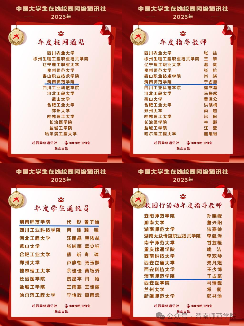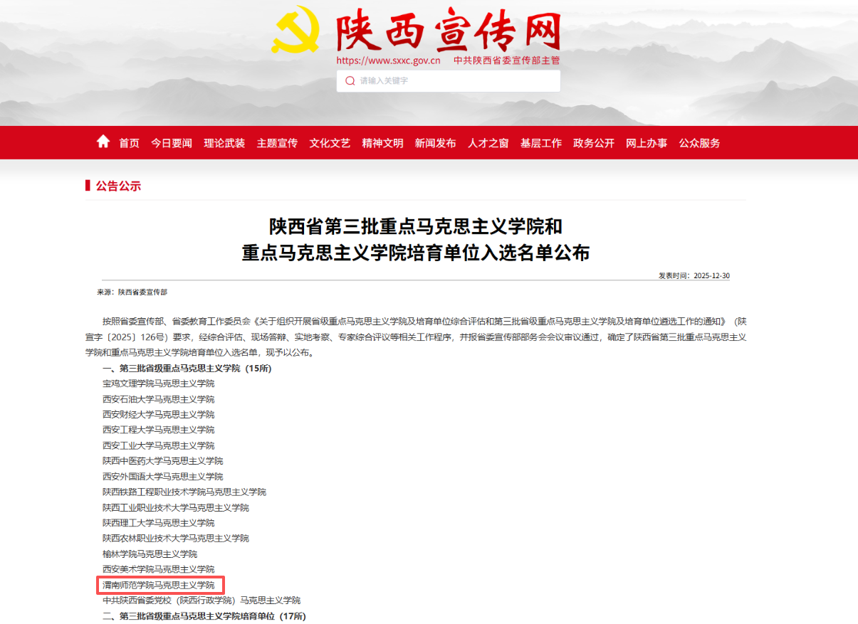 思政教育创新提质,学校精心打造“怀德铸魂‘五个一’行动”,创新推进大中小学思政教育一体化建设,高起点谋划、高标准推进、高规格筹备,全力打造可复制、可推广的“渭师模式”。马克思主义学院入选“第三批省级重点马克思主义学院”。宣传思想文化成果丰硕,学校官方微信公众号获评陕西省“走好网上群众路线”成绩突出账号(全省50个,其中高校2个);荣获教育部中国大学生在线年度“校园新媒体互动百强单位”等多项表彰;成功获批2项省级大中小学思政课一体化建设专项研究项目;另有项目被推荐参评教育部思想政治工作精品建设项目。
