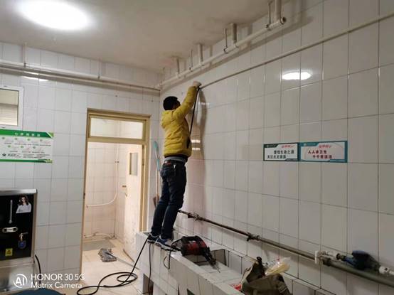 在安装现场,一名安装工人边干边给助手说:“快点,学生有需求,咱们就要有速度,为了学生生活需求保障,应该的,咱这也是为疫情防控做贡献”。“有了这个热水器,洗漱需要热水就方便多了,感谢学校,感谢后勤,感谢你们!辛苦了!”一名手提保温壶打开水的学生现场的一句暖心的致谢就是对我们工作的最大肯定。