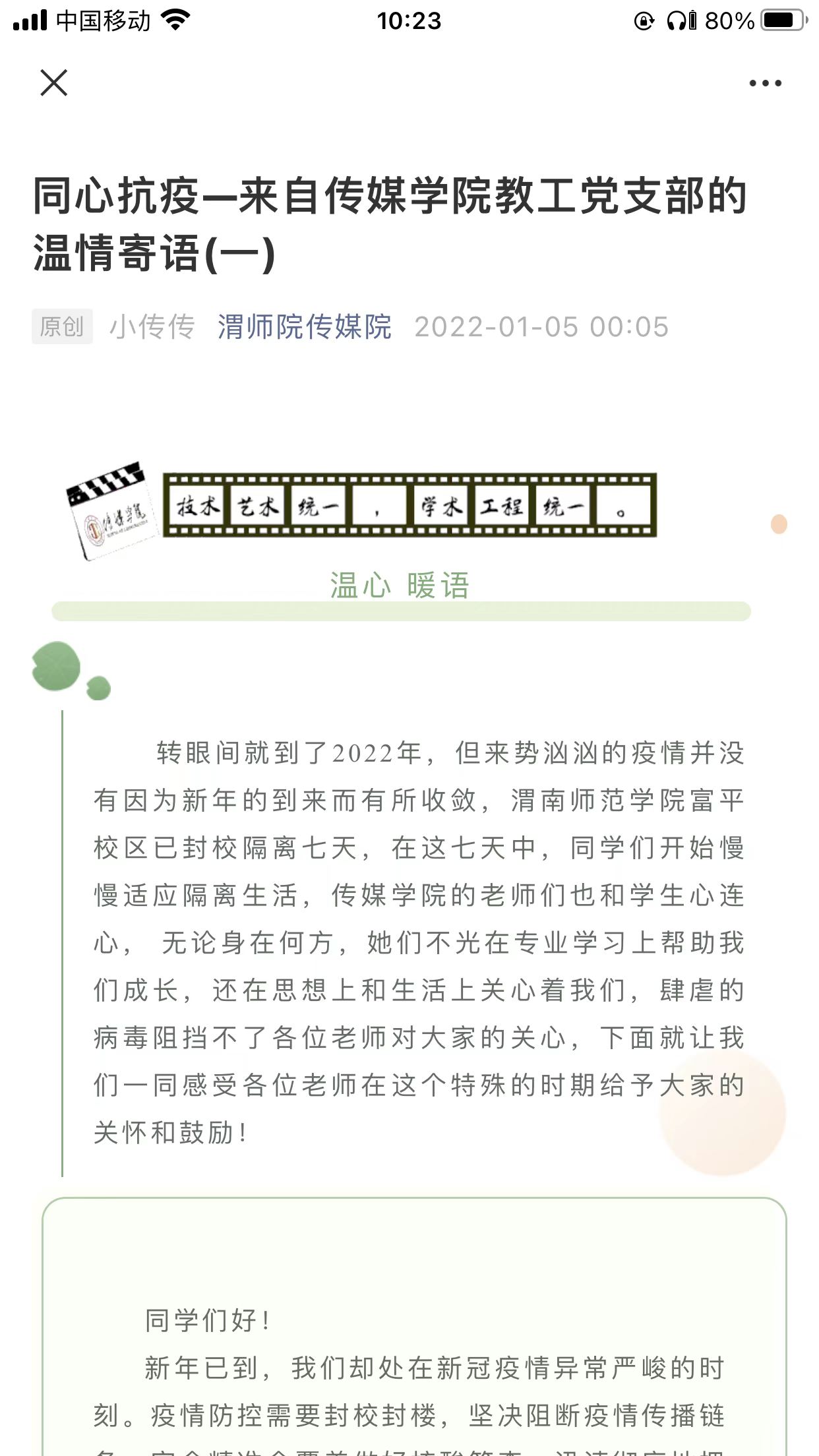 长时间在宿舍隔离,学生的生活怎么样?情绪是否正常?线上学习是否顺利...传媒学院教工支部党员牵挂着在富平抗疫的学生。