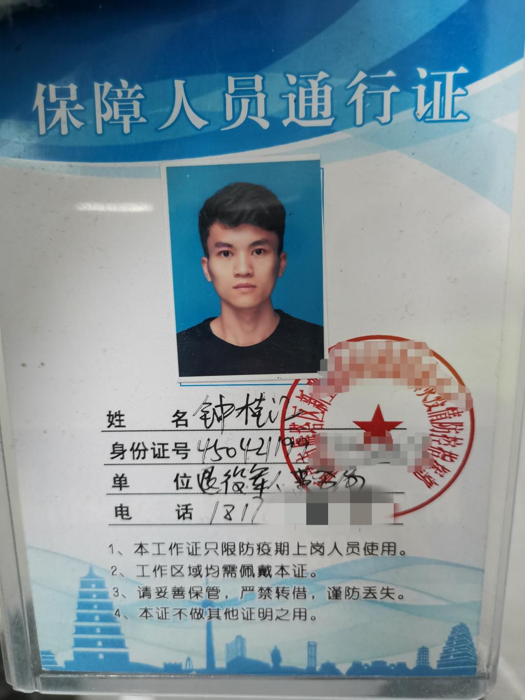 雁塔区为本次疫情较为严重的地区,在疫情发生后,钟桂江同学积极联系雁塔区退役军人事务局,加入抗疫志愿组织。钟桂江说到:“疫情爆发,国家有难,作为一名党员和退役军人,我就是党组织中可以信任的一名移动战斗员,我必将是毫无疑问要前去支援,这是一场大考,我要和大家一起战斗,坚决用实际行动为本次大考交出满意的答卷。”