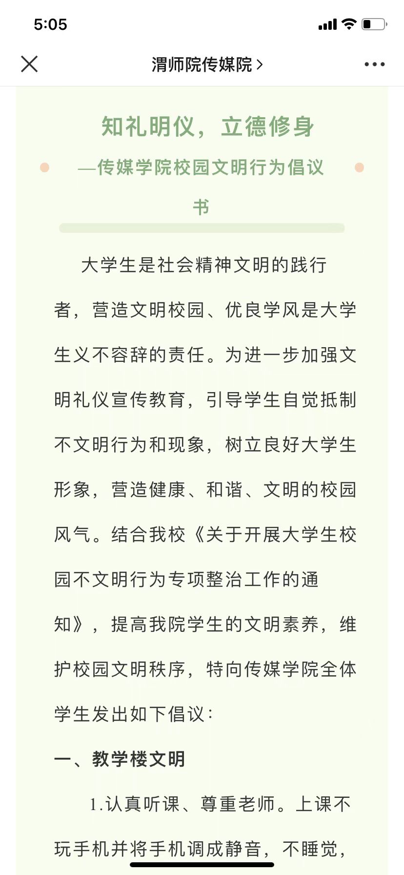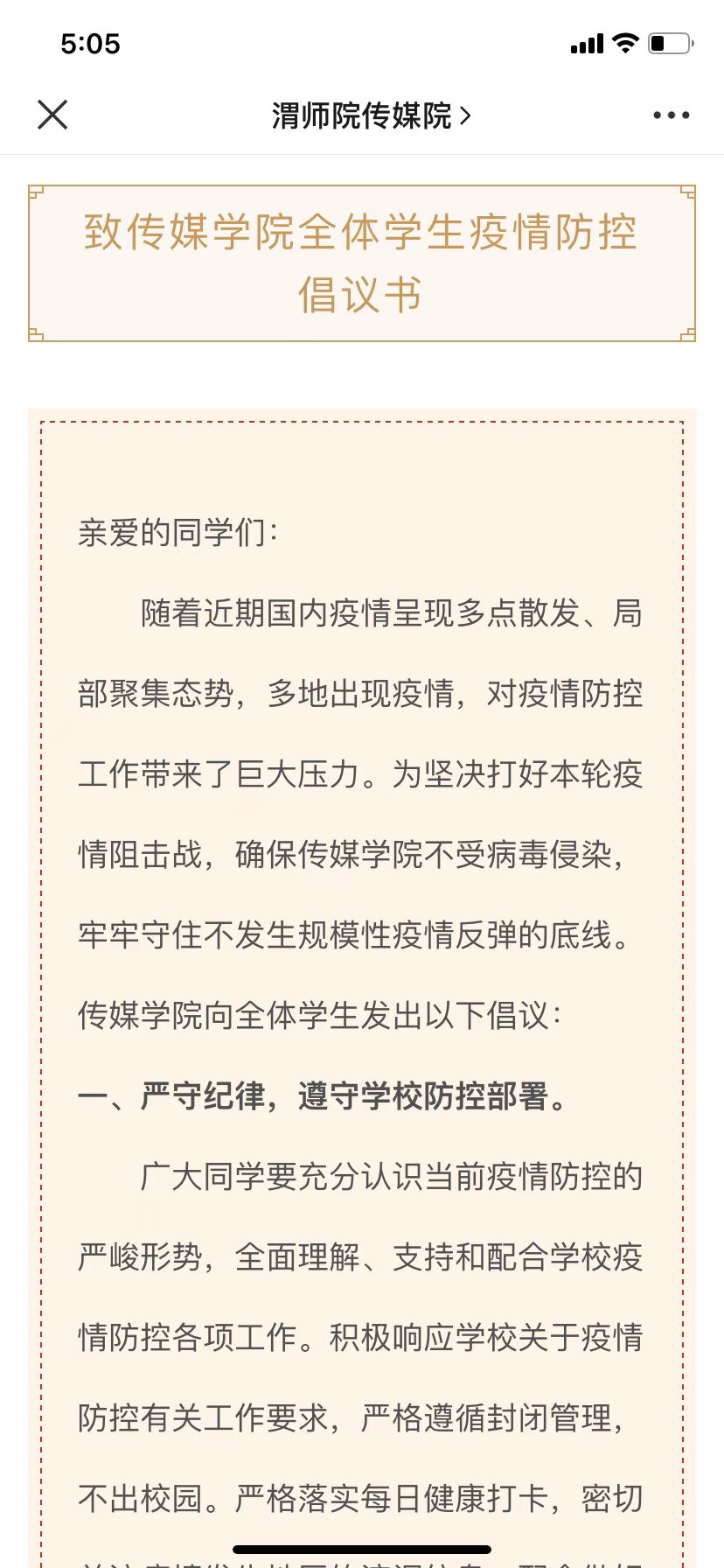 3月14日以来,传媒学院党政领导班子、5名专职辅导员全部在封闭期间留守校园,进入校园抗疫一线。深入学生公寓,了解学生诉求,倾听学生心声,做好记录,保证与学生间的紧密联系;组织完成600余名在校生核酸检测工作、及时处理学生突发情况;学院关心毕业年级,安排毕业设计指导教师进行精准帮扶,协助有困难学生修改毕设选题;组织召开学生座谈会,座谈会收集建议20余条,认真听取了学生在封校期间学生管理、教育教学和生活服务保障等方面的需求,并进行协调解决;发布《致传媒学院全体学生疫情防控倡议书》《知礼明仪,立德修身—传媒学院校园文明行为倡议书》,坚定学生抗疫信心,在全院上下营造良好抗疫氛围。
