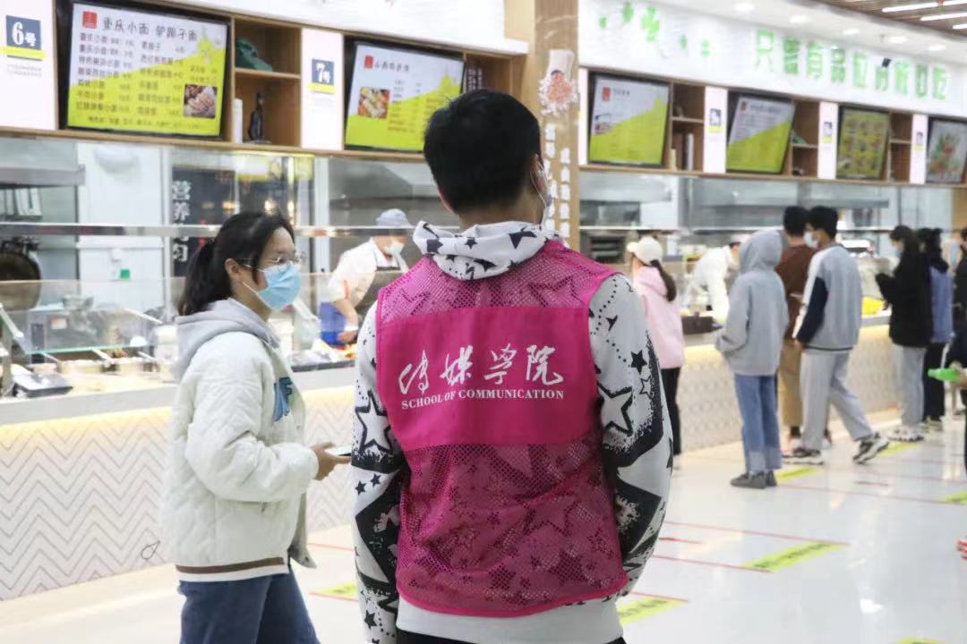 传媒学院师生党员、入党积极分子、学生会成员主动请缨,组建成一支强有力的志愿者队伍。在核酸检测现场进行场地布置、协助医护人员维持秩序;在食堂引导学生保持一米安全距离,错开就坐;坚守在校园门口,严格管控人员出入,助力防控第一线。全院师生严格落实学校规章制度相关要求,用温情筑牢抗疫防线,将小我融入大我,用实际行动来践行初心使命,贡献出一份份青春力量。