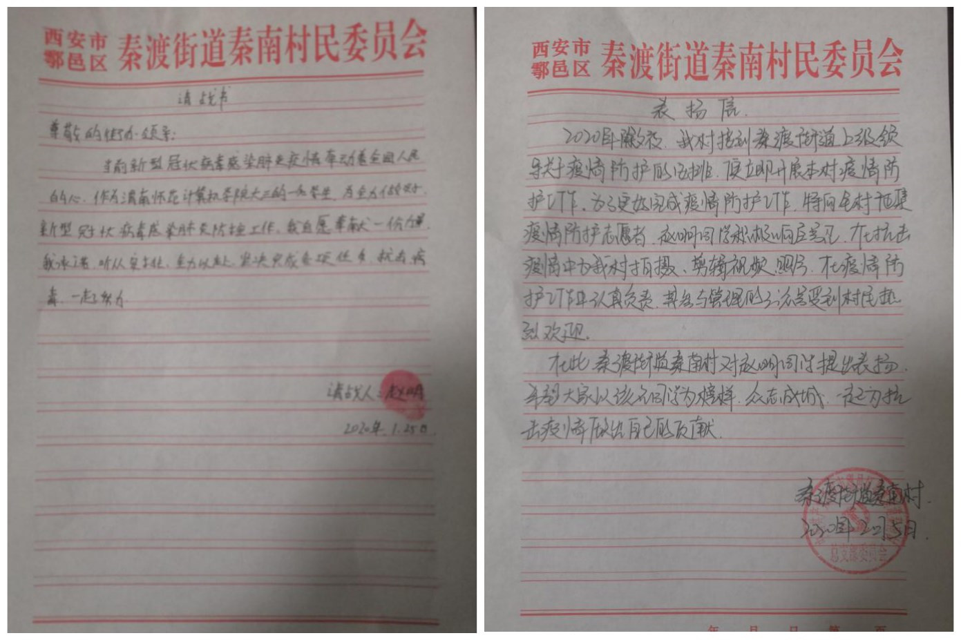 这个春节,赵明和大多数人一样有些许不安。国家正在面临严峻的考验,全国各地为打赢疫情防控阻击战纷纷开展各项举措,他的家乡西安市鄠邑区秦渡街道也不例外。1月25日除夕夜,赵明接到村委会的疫情防护志愿服务动员,在家人的鼓励和支持下,他毅然决定投身当地防疫工作,为守护好家园做出自己应有的贡献。