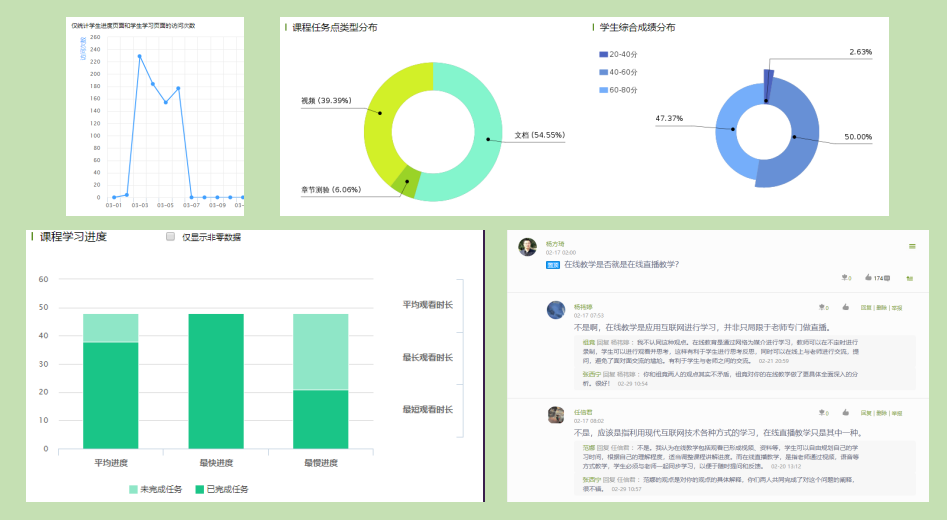 五是全面实施课程教学评价。课程教学团队充分利用在线教学平台提供的大数据分析技术,既可以整体上对所有学习者的在线学习情况进行统计,也可以中观上对每个教学班级的在线学习情况进行统计,还可以微观上对每位学习者或者每个学习任务的在线学习情况进行统计。参照大数据统计分析结果,课程教学团队对于共性问题进行统一指导,对于个性问题进行个别化辅导,显著增强在线教学的针对性和个性化,有效提升课程在线教学的实效和质量。(通讯员 杨方琦)